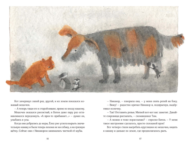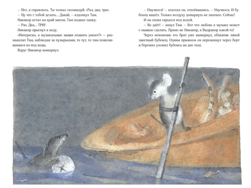 Анастасия Коваленкова не только написала эту чудесную историю, но и сама ее проиллюстрировала. Акварельные рисунки слегка мрачноватые, темные, иногда черно-белые, иногда со всплесками цвета. Как сказала моя пятилетняя дочка Саша, «их будто ребенок намулевал». А я бы сказала, что эти рисунки будто сделал сам мышонок Там – невозможно представить вместо них что-то сладкое с милыми мордашками. Нет, рисунки должны быть именно такими, они – часть повествования, часть истории.