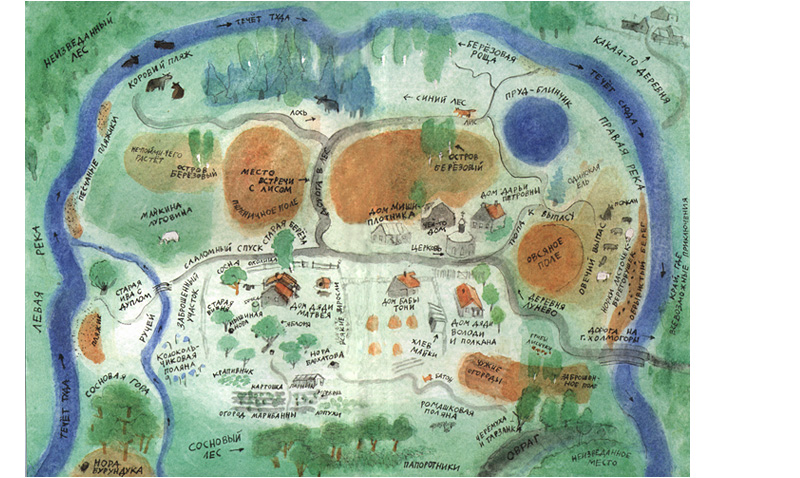 Но главное – это карта деревни Лунёво, расположенная на форзаце и нахзаце и позволяющая четко представить, как далеко от мышиной норы Синий лес, где находится выпас, на котором гуляют овечки, как река огибает деревеньку и на каких дорожках Там встретил кота Батона, козу Майку или пса Полкана. Это очень помогает – развивает пространственное мышление, рисует еще более яркую картинку. Кажется, что ты сам побывал в Лунёво, ведь пока читал книгу, то и дело возвращался к форзацу и так внимательно рассматривал карту, что уже изучил ее как свои пять пальцев. Моя дочка в каждой главе сверялась с картой, чтобы представлять, как, что и где.