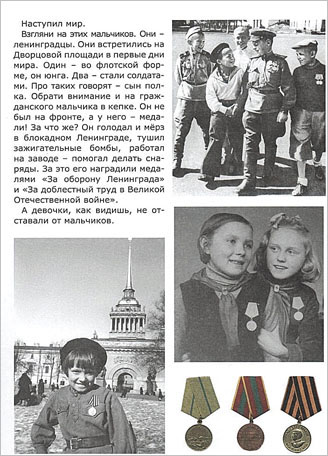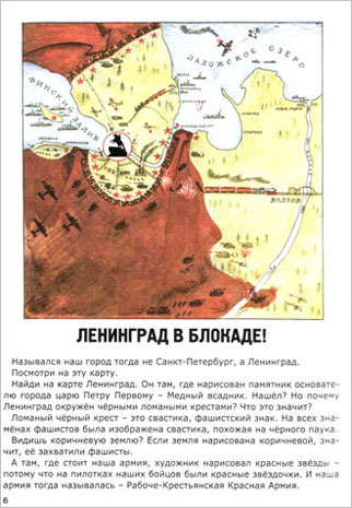 Каждый разворот книги посвящен отдельной теме, причем нередко здесь помещено буквально несколько строк текста. Сотни архивных черно-белых фотографий говорят о войне больше, чем любые слова. Фотографии отлично дополняются рисунками и картами. Не каждый взрослый сможет понятно объяснить ребенку, что значит слово «блокада» и как в ней оказался такой огромный город. Нисон Ходза отлично справляется с этой задачей, попутно рассказывая, как «читать» карту, что и как на ней обозначено. Он ведет прямой диалог с ребенком: «Найди голубую ленту реки Волхов. Нашел? Видишь – по реке плывут два парохода. Их трюмы наполнены продовольствием. Его шлет голодному Ленинграду Большая земля…. Пароходы держат путь к устью – к городу Новая Ладога. Но не может речной пароход идти по бурному, как море, Ладожскому озеру…»