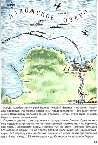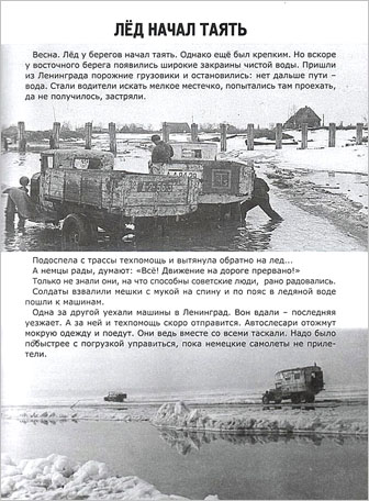 Но если бы «Дорога жизни» состояла только из рассказов о людях, вряд ли она производила бы на детей такое сильное впечатление. Трасса через Ладожское озеро – сложнейшее инженерное сооружение, и автор книги подробно и очень доступно, с множеством необычных деталей, описывает ее работу. Почему ледовую трассу приходилось передвигать каждые две недели? Зачем плывут из Ленинграда по воде десятки пустых цистерн? Как работали на льду автослесари? Ребенок, которому читают эту книгу (или который читает ее сам), с удовольствием слушает о полуторках и трехтонках, о баржах и зенитках. Вся эта техника существует не сама по себе, а в теснейшей связи с людьми, она в буквальном смысле слова дает им жизнь.