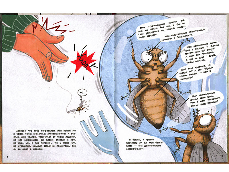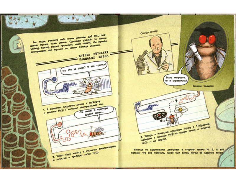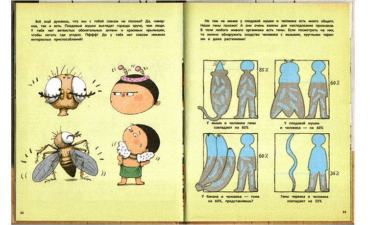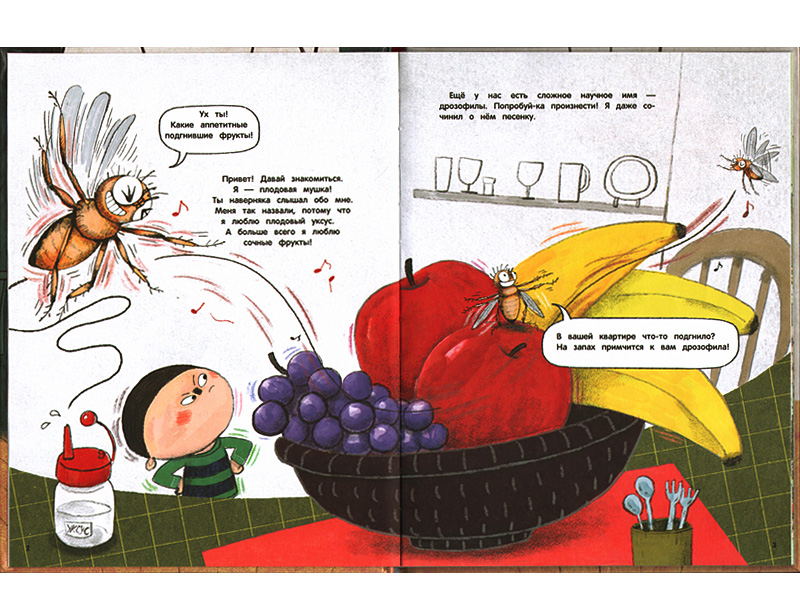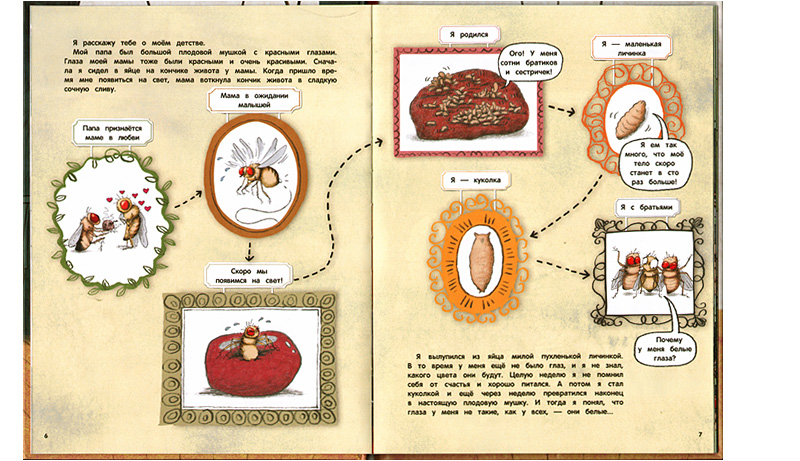 Сначала к нам прилетает плодовая мошка, она хочет полакомиться фруктами и знакомится с нами. Часть текста содержится в картинках, и даже нечитающий ребенок может участвовать в чтении. Как только мы переворачиваем страницу, Сережа продолжает рассуждать самостоятельно: «Ой, кто-то хлопает в ладоши! Улетай, маленькая мушка!» Мы проверяем, всё ли с дрозофилой в порядке: крючковидные коготки для того чтобы удержаться на гладкой поверхности фруктов, обонятельные антенны, крылья, которые, оказывается, помогают чувствовать вкусы, и белые глазки… Да, главный герой – эта редкая мушка с белыми глазами. Летом у нас иногда заводятся маленькие коричневые мошки с красными глазками, и теперь мы обязательно понаблюдаем, есть ли среди них мошки с белыми глазами, как наша знакомая. Это большая редкость, которую она унаследовала от своего дедушки, а тот от своего дедушки – Белоглаза Первого. И мы узнаём, что такие особенности, отличающие своего носителя от других, называются мутациями (а я-то считала, что мутации – это негативные изменения). Оказывается, это генетический закон, согласно которому мутации повторяются через поколение. Ведь у всех малышей Белоглаза Первого были красные глаза, а у некоторых внуков ‒ белые.