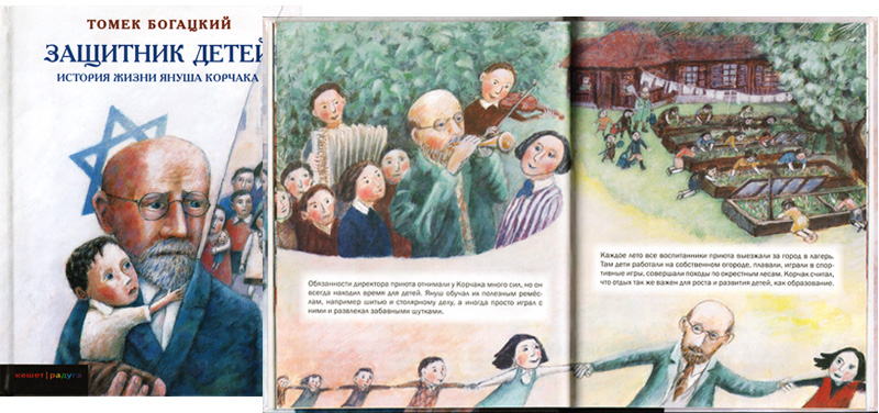 В 2010 году в издательстве «Текст» вышла книжка-картинка «Защитник детей. История жизни Януша Корчака», которую написал и нарисовал Томек Богацкий. Это хорошая, важная книжка – содержательная и горькая. Большая ее часть посвящена легенде о смерти доктора. И на обложке над головой Корчака магендовид, шестиконечная звезда Давида, – как нимб. Нимб, оказывается, не обязательно имеет форму диска…