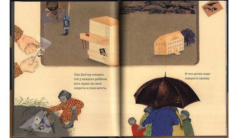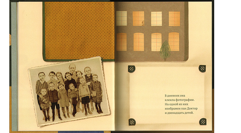 А в 2021 году в издательстве «Лес рук» вышла еще одна книжка картинка – «Дневник Блюмки» Ивоны Хмелевской. В этой книге (сложно поверить) – ни слова о смерти. И совсем другая оптика: ничего «объективного». И ничего «мифологического». О «Доме сирот» и о докторе Корчаке мы узнаем от девочки Блюмки, которая живет в Доме сирот. Блюмка ведет дневник. Пишет так, как могла бы, наверное, писать маленькая девочка, – простыми коротенькими предложениями. Каждая «запись» – рассказик про какого-нибудь ребенка. Про него сообщается самое важное, самое «характерное». Вся книга – двенадцать «портретов» детей (именно двенадцать детей – случайность ли это? – и пана Доктора мы видим на одной из «фотографий», которые Блюмка вклеивала в свой дневник, а всего в Доме сирот, как сообщает нам автор книги, их было двести). И в каждом рассказике непременно есть одно два предложения о том, что сказал или сделал пан Доктор в ответ на поступок или слова кого-нибудь из детей.
