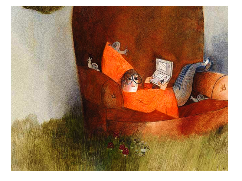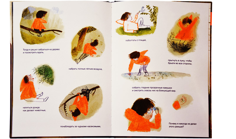 Дальше целый разворот посвящен тому, что можно делать в лесу в день волшебного безделья: залезть на дерево, напиться дождя, наблюдать за насекомыми, болтать с птицами. «Почему я никогда не делал этого раньше?» – удивляется главный герой.