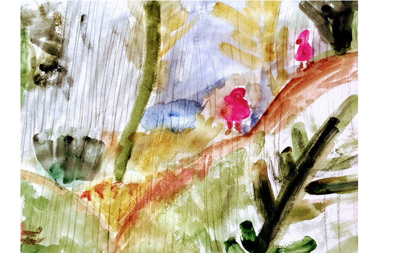 Дождь в книге Беатриче Алемании изображен полосками и узорами в виде капель. Мы попробовали изобразить такой вот «скучный» пейзаж землисто-хмурых оттенков и ребенка в ярко-розовой куртке. Использовали прием, где персонаж появляется сразу в нескольких местах, и прием в виде полосок и узоров карандашом, который передает а ощущение дождя передали карандашными полосками и узорами.