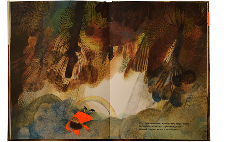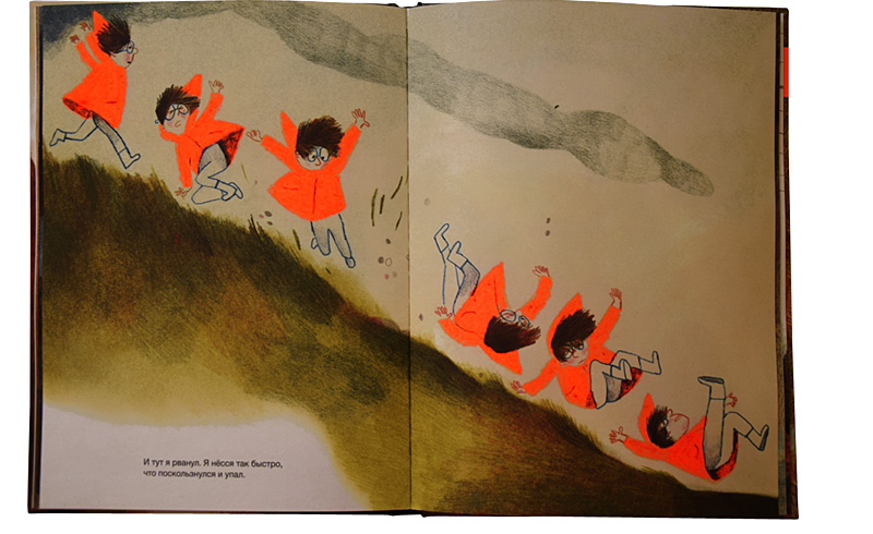 Мы обсудили разворот, на котором изображены шесть фигур мальчика, падающего с холма. Почему художник нарисовал именно так? Мы сравнили эту иллюстрацию с разворотом, на котором изображены три фигуры мальчика, идущего через дождливый лес, и решили, что тут изображена совсем иная скорость: есть ощущение, что движения вышли из-под контроля и мальчик падает.