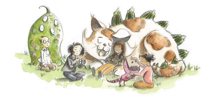 The title and cover of Marilyn’s Monster [most recent English edition: Candlewick Press, 2017. ISBN 9780763693015] will draw in a four- or five-year-old immediately. The cover teems with all kinds of creatures, monsters, and beasts. And it’s not just monsters on their own—it’s a mixed group of children and monsters. It’s a happy group—the kids are not only unafraid, but obviously good friends with the creatures around them.