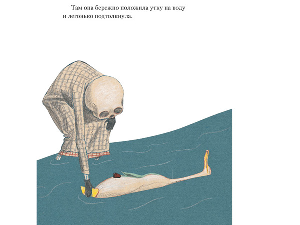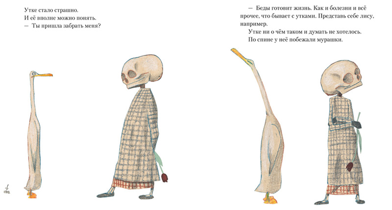 Вообще, в притчах, как и в сказках, чаще всего не бывает непредсказуемых поворотов сюжета. И если по сюжету утка встречает смерть, то рано или поздно смерть одолеет утку. Последовательное повествование, правда? В этом случае не требуется, чтобы герои были хорошо прописанными, описания – подробными, сюжетная канва – сложной. На мой взгляд, это особые книги, где самое интересное – не история сама по себе, а то, как её видит автор-иллюстратор.