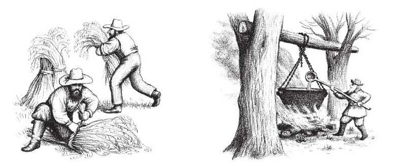 В маленьком домике царят уют и изобилие, а родители постоянно заняты делами. Охотиться и рыбачить, заботиться о посевах, об огороде, о дровах, делать запасы на зиму, собирать ягоды, мед и кленовый сок, делать покупки, за которыми нужно ехать далеко в город, готовить еду, доить корову, кормить свиней, шить одежду, делать из соломы шляпы, штопать, вышивать, стирать, своими руками делать нужную утварь, лить пули для ружья, жать, молотить, лечить, коптить мясо, ухаживать за лошадьми – все это приходится делать самостоятельно и хорошо. Потому что, схалтурить означает подвести свою семью, создав ей лишнюю работу вдобавок к уже имеющейся.