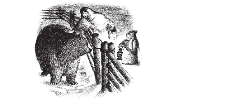 Но героиня повести – пятилетняя девочка (Лора – это сама Лора Инглз Уайлдер), и потому заботы о хозяйстве не кажутся рутинными, а наоборот, необыкновенными и волшебными. Мама с Лорой идут в хлев доить корову Сьюки и обнаруживают ее на улице. Чтобы загнать ее обратно, мама шлепает Сьюки по боку ‒ и вдруг обнаруживает, что это вовсе не корова, а медведь, который смотрит на них блестящими маленькими глазами.