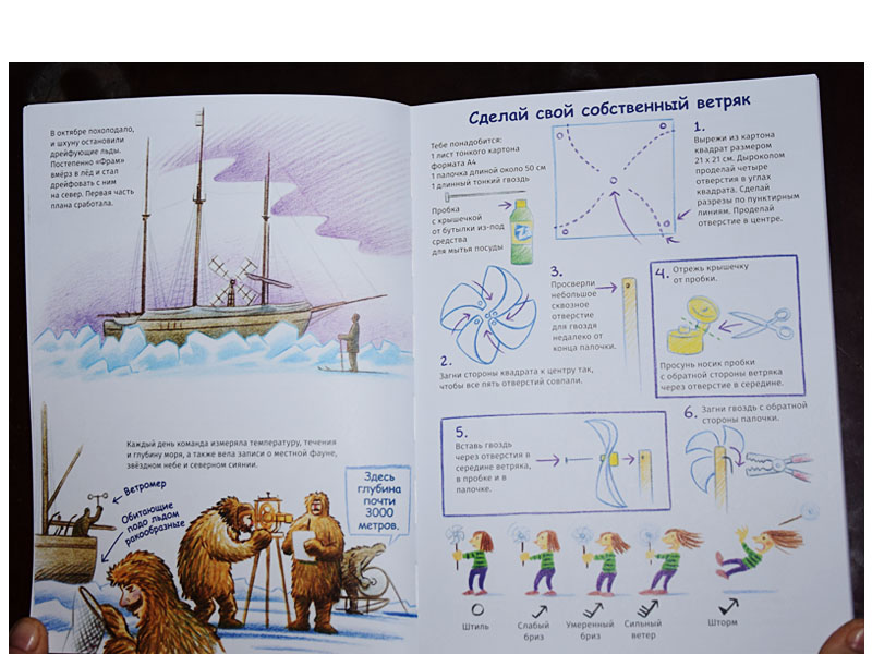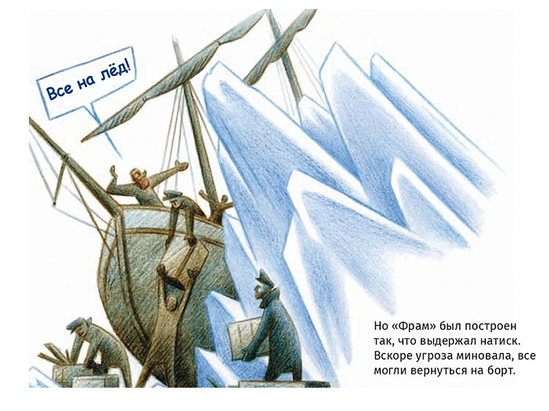 Экспедиция отправилась в 1893 году и была длительной. Всю зиму и все лето корабль дрейфовал со льдами. Признаюсь, я и сама не очень представляла, как и с какой скоростью это происходит, поэтому пришлось погуглить, «как корабль дрейфует во льдах». Оказалось, это очень медленный процесс, и корабль как бы стоит на месте. «Фрам» вмерз в лед и не двигался, а двигался сам лед, поэтому полярники могли выходить на пробежку вокруг корабля и исследовать движение ветра, местных животных и погоду. А первый в мире ледокол, пробивающий путь через лед, ‒ «Ермак» под управлением Макарова, ‒ вышел в плавание позже, в 1899 году. Важно уточнить эту разницу для ребенка (без углублений в даты, разумеется).