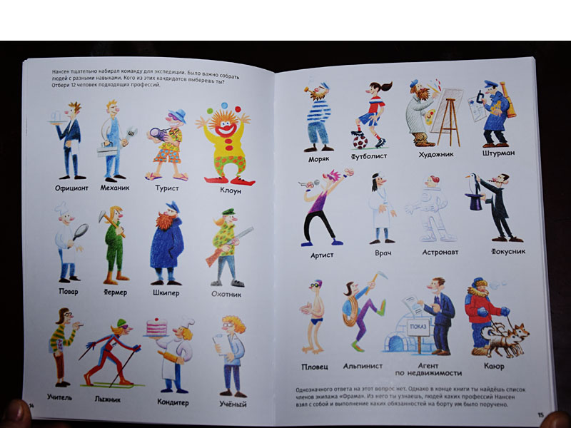 На страницах книги есть задание: кого из людей предложенных профессий ты выберешь? Нужно выбрать лишь 12 человек. Аня справилась, выбрав представителей самых подходящих для полярной экспедиции профессий и не взяв на борт певца, клоуна, фокусника и других харизматичных претендентов (правда, без кондитера ее экипаж не обошелся). Первым она выбрала капитана, матроса, затем механика и повара.