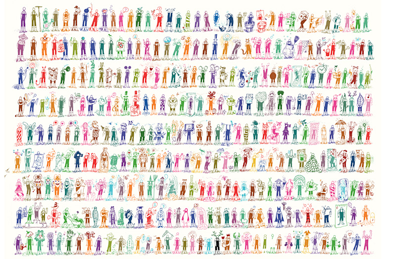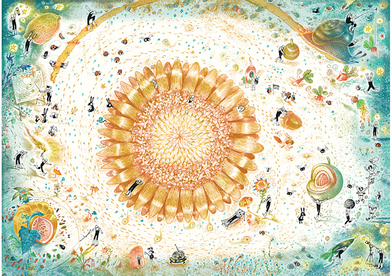 Это книга альбомного формата, с полноцветными графическими иллюстрациями Винсана Грава. Мне особенно запомнились две вводные картинки: на первой человечек с лейкой и граблями, стоя на коленях, трепетно вкладывает в землю единственное семечко, а на второй он, крошечный, стоит посреди разросшегося сада.