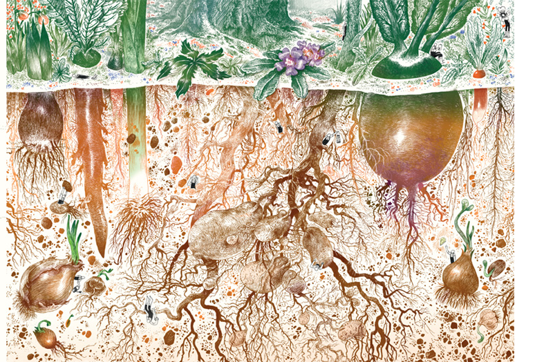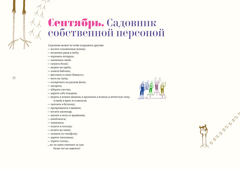 Некоторые главы рассказывают о фантазиях садовника. Садовник возится с землей. Что будет, если оказаться под землей? Там бы мы увидели самые разные клубни и корни и удивились тому, как растения «общаются» друг с другом, выдерживают дистанцию или избегают контакта: «Говорят, лук-порей любит садовую землянику...»