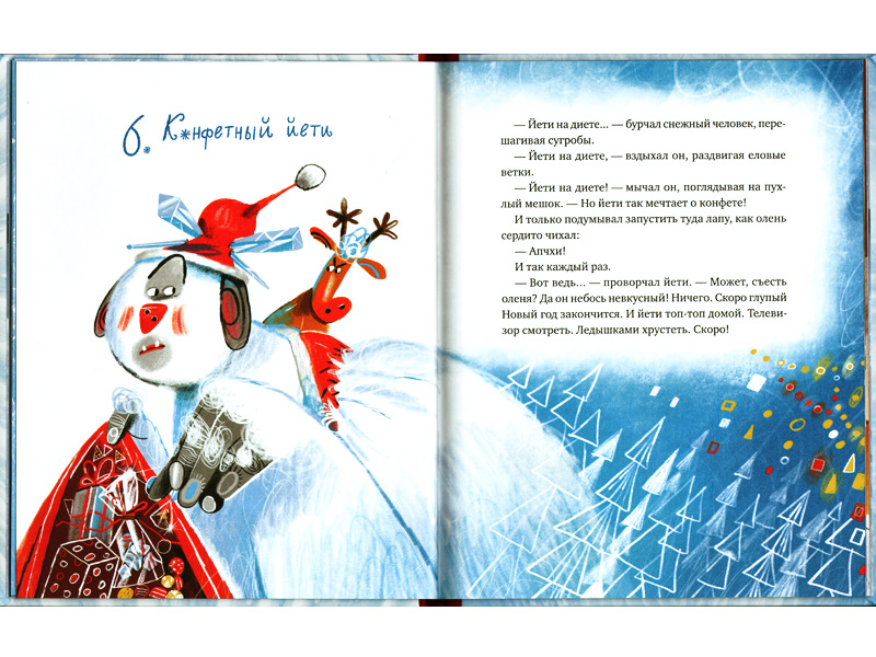 Иллюстрации Александра Шатохина достаточно сумасшедшие, в постоянном движении, и в меру абстрактные ‒ как раз для такой истории. Рассматривая их, можно допридумать историю: оказывается, у Снежинкина рыжие волосы, а у йети есть чубчик…