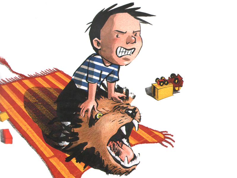Обычно к нам приходят старшие дошкольники или 7–8-летние. Но сегодня мы пригласили малышей – и вот они сидят передо мной, болтают ножками, ждут. Пробую, как обычно, сначала побеседовать, оттолкнувшись от обложки и названия книги. Что мы видим? Нарисован мальчик, который, судя по всему, и рычит. А бывает ли так, что кто-нибудь из моих гостей издает такие же звуки, как животные? Выясняется, что мяукают многие (и, видимо, частенько), а лаять, ржать или рычать в обычной жизни никому не приходит в голову.