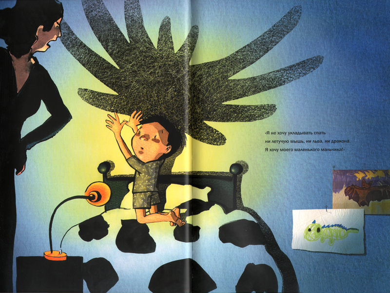 Читая дальше, я попутно достаю крышку от кастрюли и щетку – дети смеются, а потом удивляются сходству с иллюстрацией: книжная мама успокаивает своего дракончика, размахивая щеткой-мечом и прикрывается крышкой-щитом.