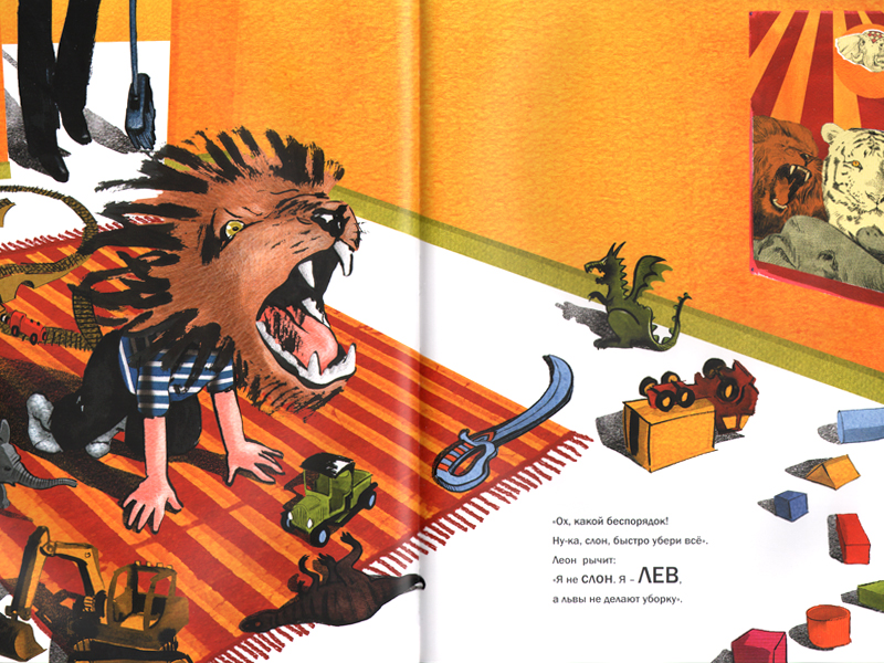 Пока мы шли в библиотеку, моя младшая дочь успела побыть кошкой, собакой и зайчиком. А первая же маленькая слушательница «Почитайки» вошла в дверь, мяукая. Ну как будто специально! Ведь ожидающая нас книжка «Леон рычит» – именно о бесконечных игровых перевоплощениях детей трех-пяти лет.
