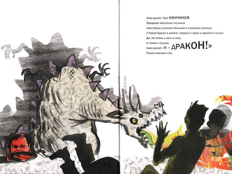 И вот перед нами, наконец, первый книжный разворот с уставшим малышом перед тарелкой с одной свечкой, на заднем плане – большие темные фигуры взрослых. Дети сочувственно затихают. Но Леон не грустит, - он злится, и страница за страницей мы вместе со слушателями начинаем проживать с ним этот непростой вечер.
