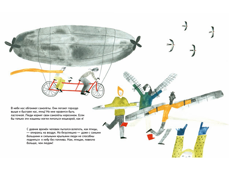 Иллюстрации Ольги Пташник нежные, и вместе с тем в них много веселой игры: то люди тщетно пытаются подняться в небо на самодельных крыльях, то слоны, ухмыляясь, вспугивают мошек из травы. А какой ураган с черными крутыми волнами, поглотившими огромный корабль, – но только не ласточку!