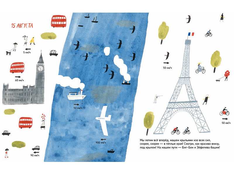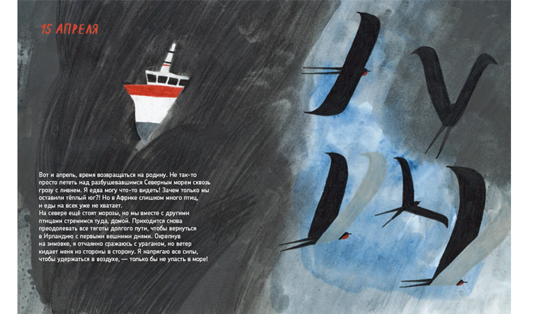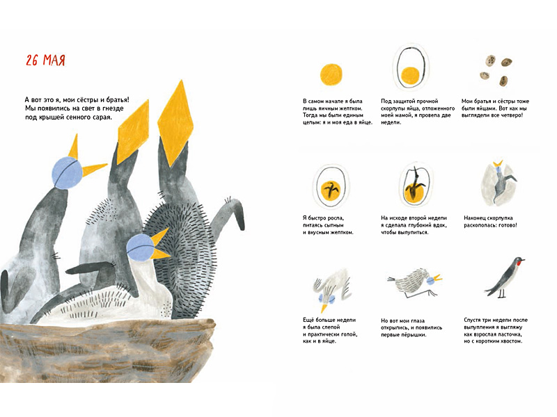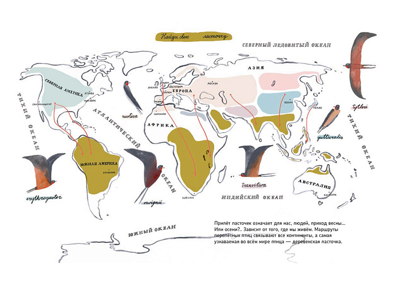 «Маршруты перелетных птиц связывают все континенты, а самая узнаваемая во всем мире птица – деревенская ласточка», – написано в предисловии к книге «Дневник ласточки». Ее авторы, зоолог Павел Квартальнов и иллюстратор Ольга Пташник, предлагают ребенку старше шести лет «найти свою ласточку» на карте. А весь последующий текст – от имени ласточки, иногда с обращением к читателю. Вместе с молодой ласточкой читатель совершит путешествие из Ирландии в Африку через моря, горы, пустыню и тропические леса.