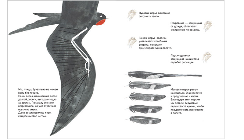 Короткие путевые заметки, написанные поэтично, перемежаются орнитологическими подробностями. Например, читатель наблюдает за рождением и взрослением ласточки: зародыш в яйце, голый птенец, быстрая птица, щебечущая на проводах. Или разбирает виды перьев: пуховые перья на теле сохраняют тепло, маховые на крыльях помогают летать, а рулевые на хвосте поддерживают равновесие в полете (не хватает пера, которое вырвал чеглок!).