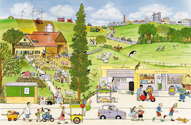 Катерина Омельницкая:…Книги Ротраут Сузанны Бернер рассмешила, вызвали желание рассматривать подробности, сочинять на ходу веселые истории про ее персонажей. Я сама с детства рисую картинки со множеством мелких деталей. Иногда в процессе рисования я склеивала длинные полосы из альбомных листов и дорисовывала на них такие же дома, улицы, города... Каждый день мой рисунок удлинялся и приобретал новых жителей и новые смешные моменты и истории…