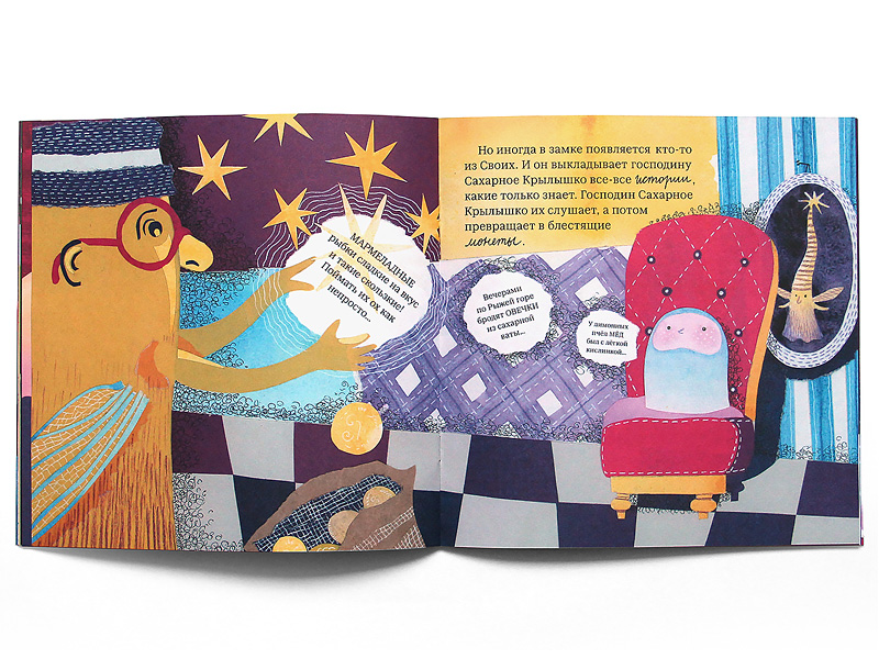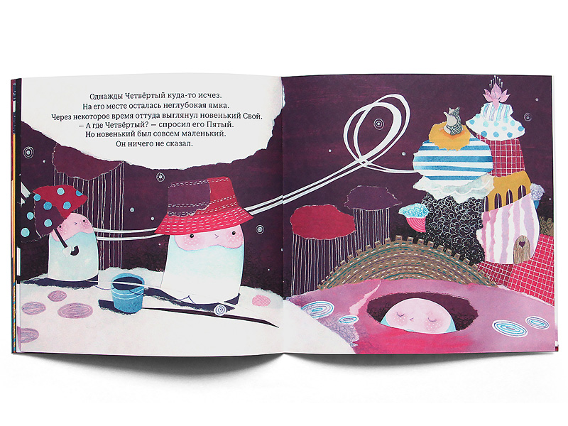 Во-первых, это книжка-загадка. И до самой последней страницы читатель может строить версии о том, кто же он такой – Пятый, главный герой книги. Он живет в тесном спальном мешке, вокруг него что-то стучит и булькает, он умеет различать вкус цвета. «Красный – сочный и сладкий, оранжевый – холодный и праздничный, белый – теплый и мягкий, зеленый – соленый и хрустящий, а от желтого та-а-ак кисло!» Внимательный читатель, ребенок или взрослый, постоянно получает подсказки – особенно если пристально вглядывается в иллюстрации. В снегоуборочной машине узнается зубная щетка. В Первом, Втором, Третьем – соседи-зубы. Однако что за замок из подушек, на крыше которого сидит Серебряный Медведь? А сам замок принадлежит какому-то Сахарному Крылышку. Кто это? Ответов на эту загадку в книге нет, и каждый может сам решать, что за «зубные образы» скрываются за этими героями. И только на последней, потайной страничке мы узнаем, что Пятый – это молочный зуб.