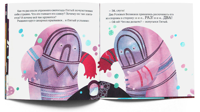 Вот два розовых великана раскачивают Пятого, и какая-то неведомая сила уносит его с насиженного места. Кем могут быть эти великаны? Может быть, это пальцы? А куда его уносит? В реку? В воздух? В замок из подушек? Что он там будет делать? Чтение этой книжки вместе с ребенком дает огромный простор для обсуждений. Как ты думаешь, Пятому страшно? Или любопытно? Что будет с ним происходить дальше, в замке?..