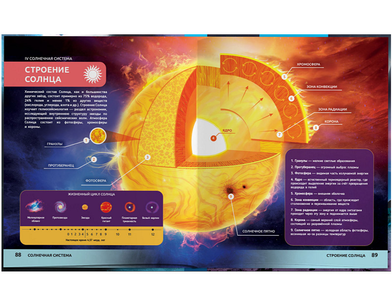 Это настоящая современная энциклопедия: увеличенный формат, яркие, выразительные иллюстрации и фотографии. В книге несколько больших разделов, и в начале каждого представлено его содержание. Если средневековая модель вселенной неинтересна или хорошо знакома читателю, то легко перейти к жизненному циклу звезды или к самым загадочным звездам Млечного Пути.