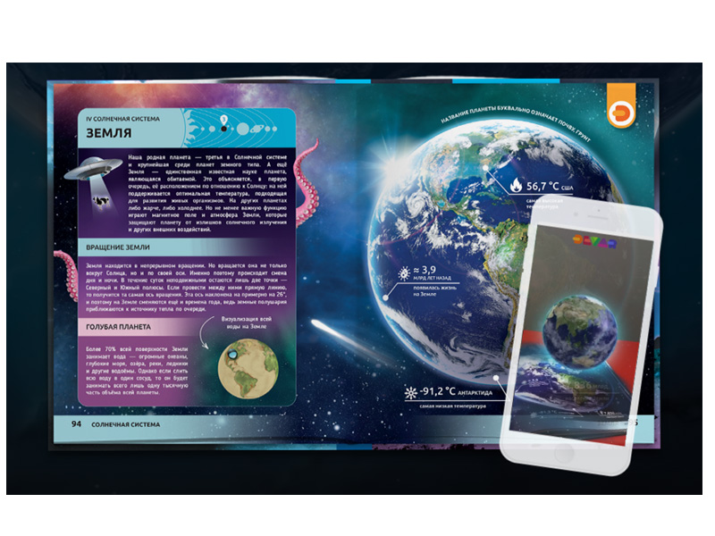 Текст представляет собой только часть книги. Я не сразу обратила внимание на то, что на обложке есть QR-код, а на многих разворотах открывается волшебный портал для перехода в электронное приложение. Но сын сразу же после первого прочтения сказал, что хочет продолжить знакомство с книгой через девайсы.