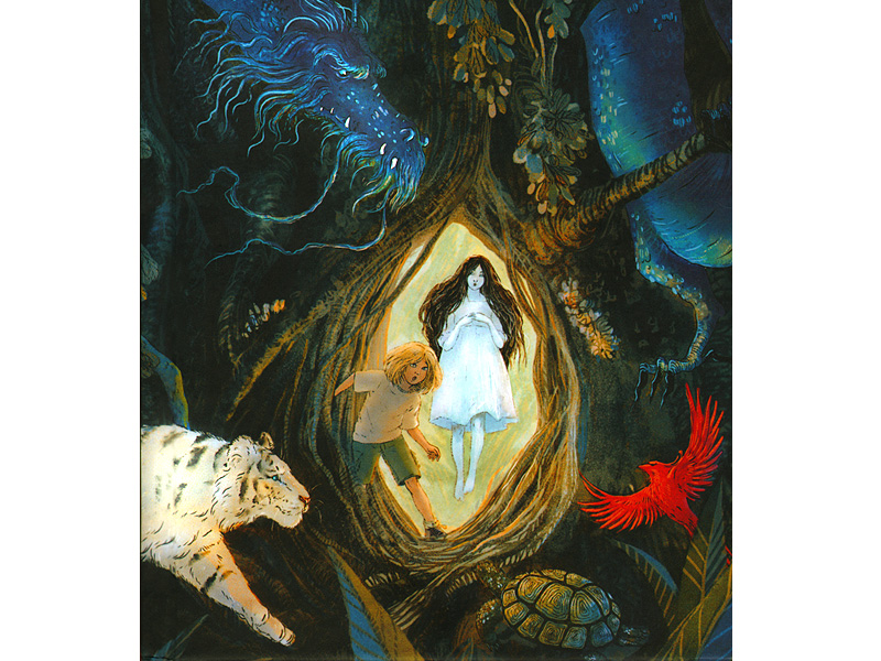 Книга начинается с обложки. И обложка «Голодного призрака» подсказывает нам, что сюжет у книги будет необычный, связанный с переходом в другие миры. Мы видим четырех животных: Белого Тигра, Черепаху, Дракона и Птицу-киноварь. А в центре ‒ огромное волшебное дерево баньян, которое служит как бы порталом в другие миры. Из его светящегося дупла выходят две девочки, Лин и Фрэйя. Одна живая (Фрэйя), а другая (Лин) умерла уже много лет назад…