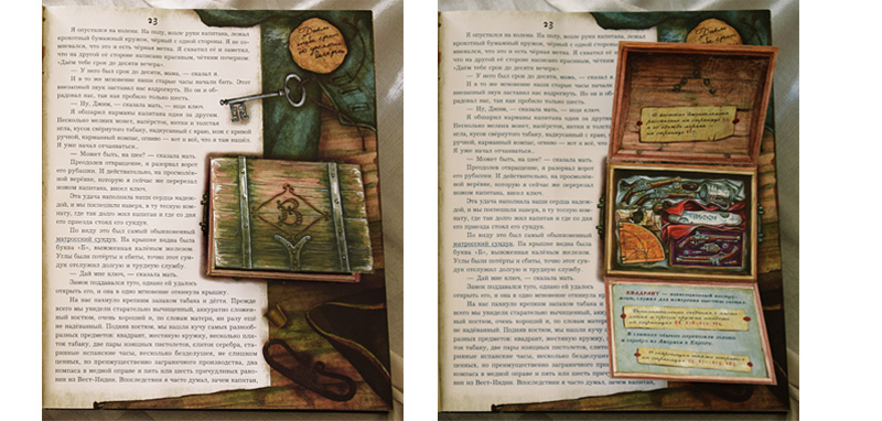 Например, на странице 23 есть матросский сундук и подробно описано всё, что герои нашли среди имущества старого штурмана вместе с картой сокровищ: резные пистолеты, украшенные золотыми узорами, морские измерительные приборы, сюртук и треуголка, разнообразные морские ракушки и множество разных монет.