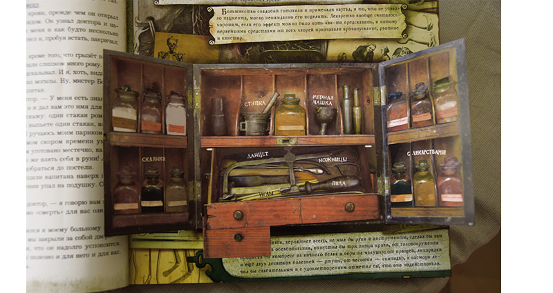 На странице 14 тоже был «сундук», но не матросский, а принадлежащий доктору. В нём можно открывать ящики, и он содержит разные инструменты, которые использовали врачи 18 века, а именно: ступку, мерную чашу, разнообразные склянки с лекарствами, ланцет, иглы, ножницы, пилу и весы.