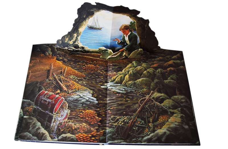 Ну а в самом конце книги читателя поджидает самая интересная, по моему мнению, и масштабная интерактивная вставка. Там изображена пещера, где огромными кучами раскиданы сказочные богатства капитана Флинта. Кучи золота можно «открывать», и внутри будет много интересной информации про деньги того времени. Например, знаменитый пиастр равен восьми тогдашним бразильским реалам, или одному испанскому доллару.