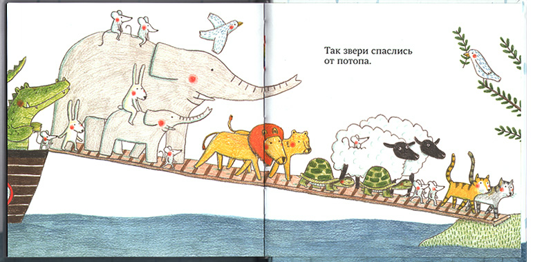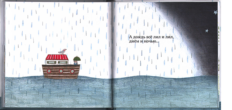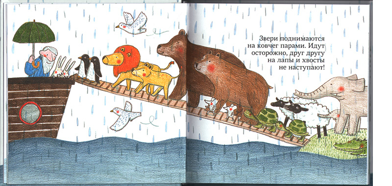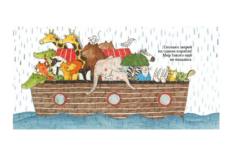 Звери парами поднимаются на корабль. Здесь нет отсылки к хрестоматийному «каждой твари по паре». Где-то угадывается разнополость персонажей, вышагивающих по трапу, а где-то их просто двое. Ну так и дети в детском саду частенько ходят парами. Принцип «тут всё, как у детей» последовательно выдерживается. И жизнь животных на корабле – с их играми и печалями – очень похожа на детскую. И даже тягости ожидания – все устали, все начали от усталости ссориться, а перемены к лучшему так и не наступают, – тоже описаны так, чтобы дети их «опознали».