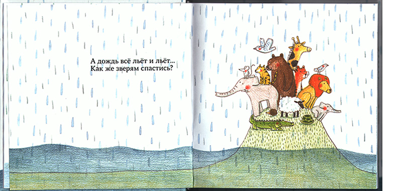 Дальше все развивается динамично и напряженно (с той долей напряжения, которую по силам воспринять двух-трехлетнему малышу), причем сразу и в тексте, и на картинках: звери сгрудились на крошечном островке. Зверей ровно столько, сколько может воспринять маленький ребенок. И нарисованы они так, что каждого можно «опознать». Их можно пересчитать, среди них есть большие и маленькие, высокие и низенькие: любая выдающаяся книжка для малышей всегда не только «повествует», но и обязательно исподволь, между делом обучает.