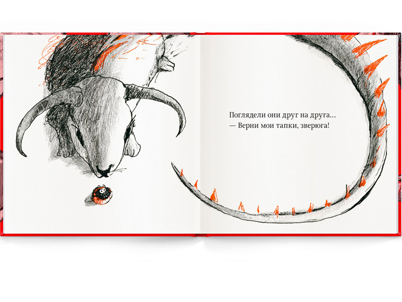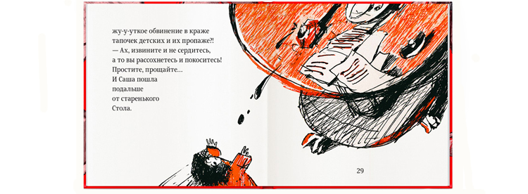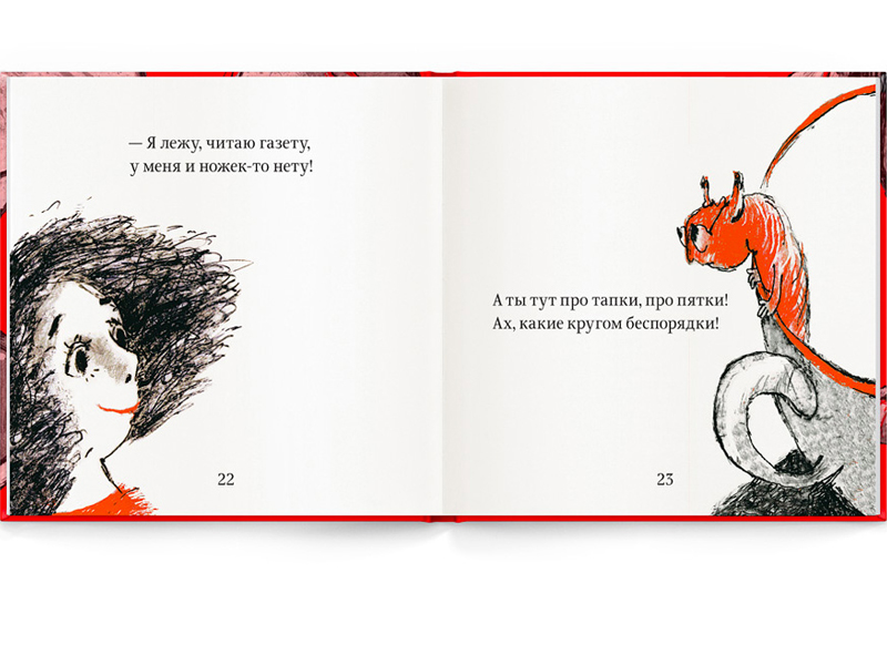 Есть книжки, где картинки рождаются из текста, а есть – где текст рождается из картинок. Анастасия Коваленкова – такой талантливый художник, что ее рисунку недостаточно линий и красок, ему надо еще выплеснуться в слово. Глазастенькая и носатенькая Саша сначала явно нарисовалась, а уже потом рисунок вызвал к жизни книжку под названием «Тапки». Эта забавная стихотворная история для чтения вслух совсем маленьким детям – перед сном или просто когда захочется почитать и картинки поразглядывать. Замысловатые, хотя всего в две краски – черную и красную – картинки вьются вокруг белой страницы и причудливо разбегаются под разными углами. Макет книжки создан в студии Артемия Лебедева.