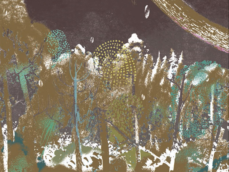 Иллюстрации (они есть на каждом развороте) напоминают монотипию. Особенно листья деревьев и растений на переднем плане. Выглядит это так, как будто художница взяла реальные растения, обмакнула в краски и приложила к страницам (а может, так и было…).
