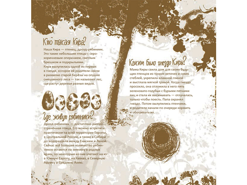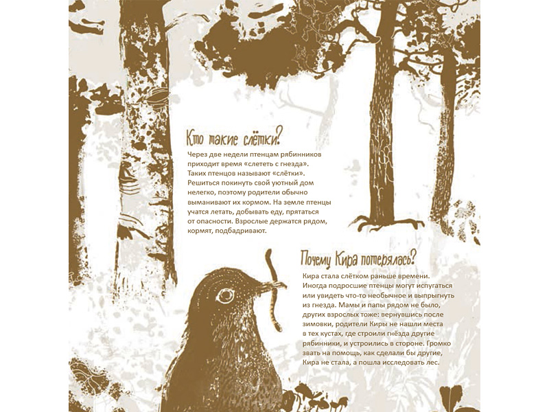 Для меня книга «Из гнезда» оказалась своеобразной энциклопедией в развлекательной форме: рассказ о приключениях Киры и Яши сопровождается объяснением разных природных явлений (я о них раньше не знала), которые описываются в тексте – да еще и дополняется занимательными подробностями и интересными примерами из жизни.