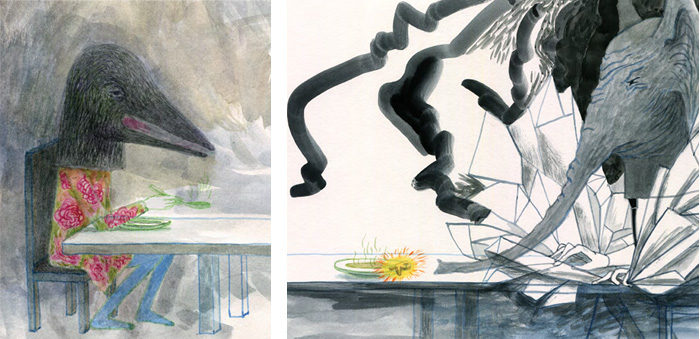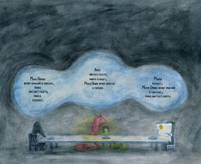 Мама Моны носит эффектную маску вороны и не менее эффектное платье с розами. Как только папа девочки в ярости бросил газету и уничтожил пылесосом все разбросанные по дому буквы, мы вместе с Моной увидели, что папа ‒ огромный «слон»…