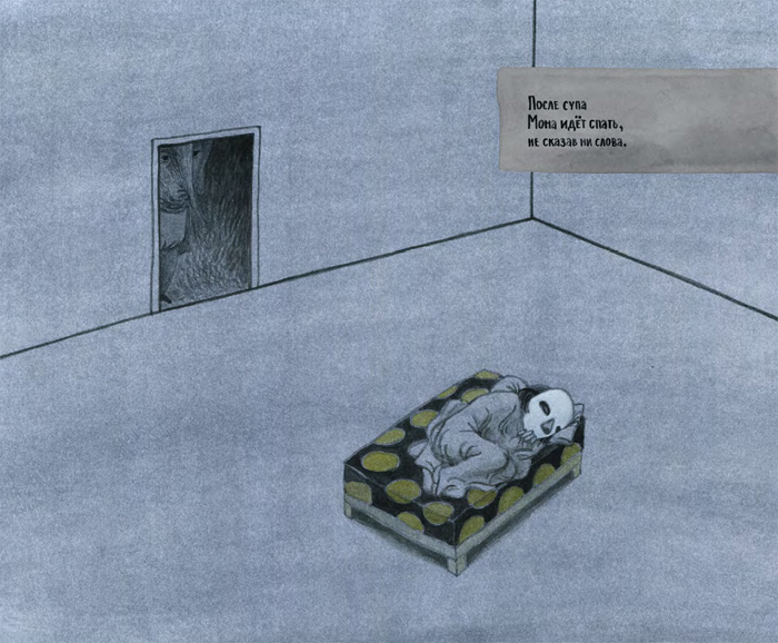Слов действительно больше нет. И вообще ничего нет. Мона Оляля одна в пустой комнате: она ходила в школу, ела суп и легла спать, спрятавшись под одеяло. В маске.