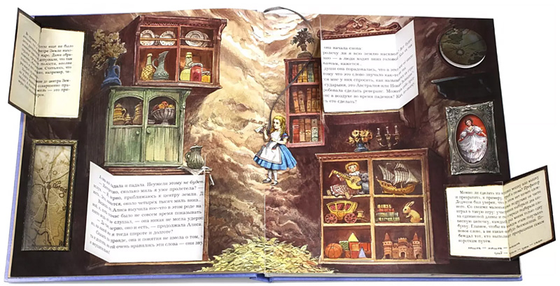 Оформление каждого разворота книги поражает своей оригинальностью. Например, текст, где рассказывается о падении Алисы в колодец, напечатан в дверцах шкафчиков, которыми были уставлены стены колодца.