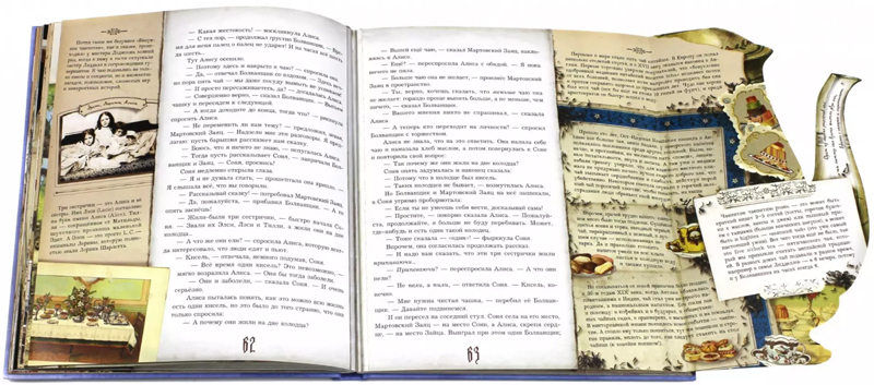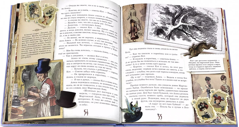 Получив в подарок одну из моих самых любимых книг «Алиса в Стране чудес», я узнала об интерактивных книгах издательства «Лабиринт». Дома на полке у меня стоит несколько других изданий «Алисы» с хорошими и подробными комментариями, но здесь комментарии находятся не в конце книги, как обычно, а рядом с самим текстом сказки, и представляют собой различного вида рисунки и вкладки, которые можно не только рассматривать и читать, но еще и потрогать, покрутить, повертеть. Благодаря такому прекрасному оформлению уже с первой страницы складывается впечатление, что ты по-настоящему попадаешь в мир волшебства и тайн. Каждая страница полна сюрпризов и открытий.