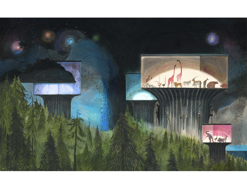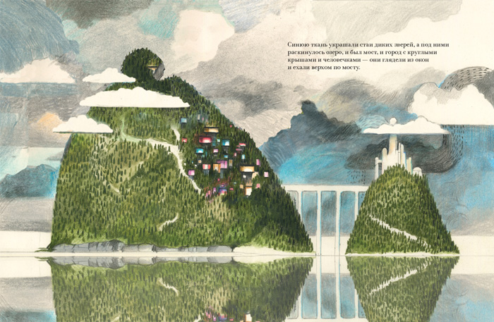 «Сначала я придумал мир сна с красочными животными, ведь мы обращаемся к воображению ребенка, ‒ рассказывает художник книги Иван Сергеев. ‒ Нарисовал пробный эскиз ‒ иллюстрацию с головой великанши и завороженными зверями. Голова великанши ‒ самая высокая точка, я расположил ее на большом острове (здесь живут животные), а людей и город ‒ на малом. И тут нашлось место для моста. В итоге вышло, что мост, как всегда, является символом перехода из одного мира в другой: люди и животные, сон и явь».
