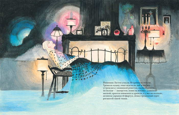 «Нянюшка Лагтон уснула. Всхрапнула могуче. Уронила голову, очки вздела на лоб и так вот устроилась у каминной решетки, палец торчком, на пальце ‒ наперсток; повисла иголка с длинной ниткой; храпела нянюшка и храпела, а у нее на коленях, целиком укрывая ей фартук, лежал громадный отрез расшитой синей ткани…»