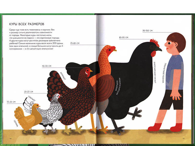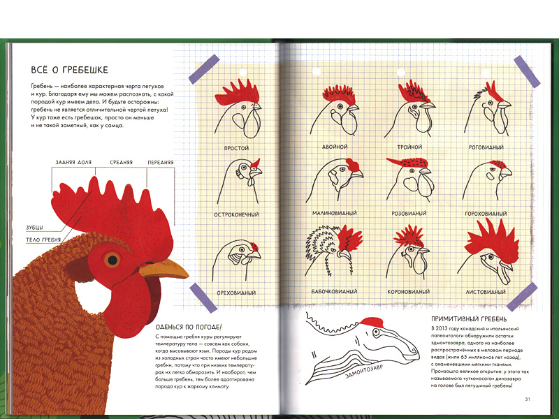 Да, я не оговорилась – ключевой глагол здесь именно «рассматривал». «Курицеведение» ‒ очень удачный пример визуальной энциклопедии. Информации колоссально много (тематический список выше – примерно одна треть того, что есть в книге), при этом она «растворена» среди иллюстраций, каждое слово подкреплено картинкой, так что факты и понятия усваиваются незаметно и легко, не остается ощущения «информационной перегрузки». Как сформулировал Ваня: «Ну, картинки-то смотреть все любят. А потом еще оказывается, что ты кучу нового узнал».