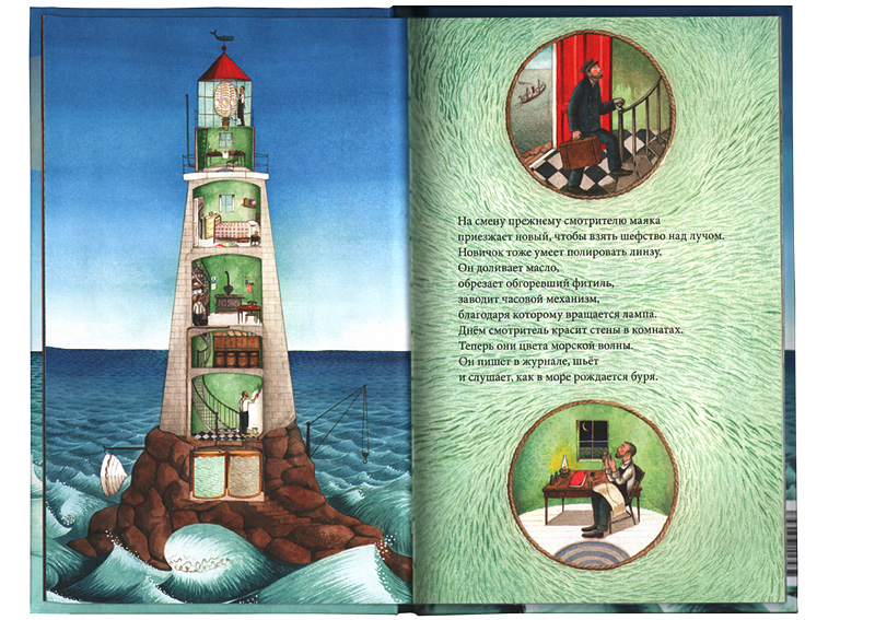 «На самой высокой скале самого маленького острова на самом краю света стоит маяк. Он построен на века, чтобы посылать в море свой смелый луч и освещать путь кораблям». Волшебное, сказочное начало. Открываешь первую страницу ‒ и слышишь шум моря, набегающего на остров волнами с белыми барашками, крики чаек и гудок парохода, везущего на маяк продукты и почту с материка. Переворачиваешь еще одну ‒ и видишь маяк в разрезе, с винтовой лестницей и круглыми комнатами. Оказывается, это отличный дом! Тут тебе и кухня, и кладовая с припасами, и комната с кроватью и книгами. А на самом верху ‒ огромная линза, которую нужно тщательно протирать, и еще, конечно, заправлять фонарь маслом, чтобы всегда, даже в самую сильную бурю, издалека был виден спасительный огонь.