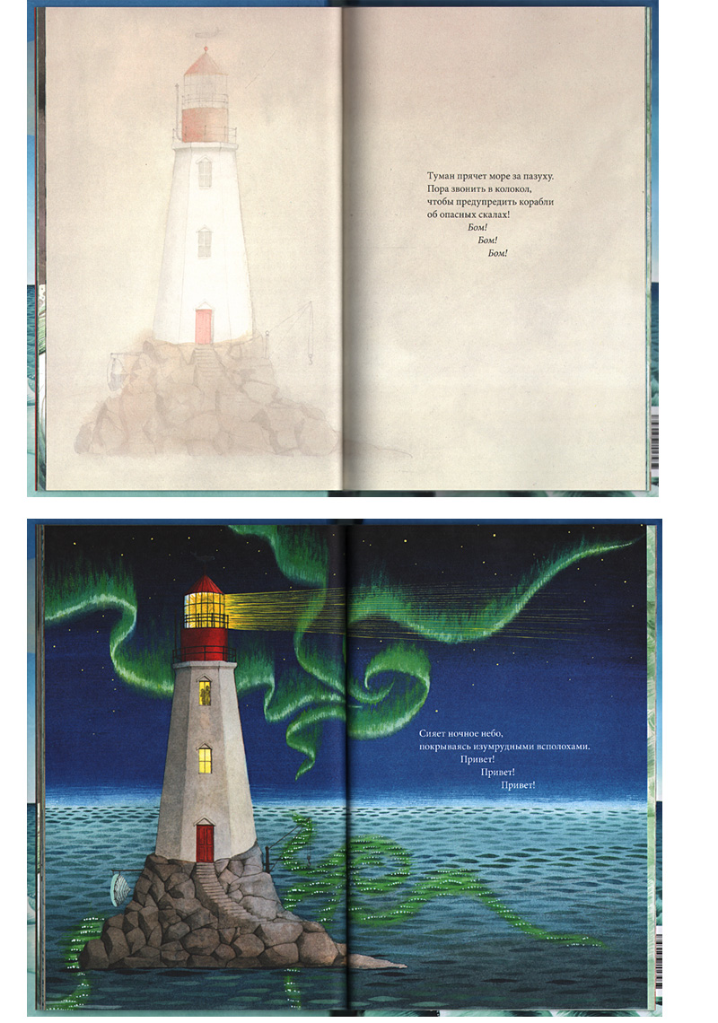 Рутинная повседневность, складывающаяся из бесконечно повторяющихся действий, выглядит здесь невероятно поэтичной. Все вокруг маяка живое – луч света, разрезающий тьму, море, каждый день разное, ветер, туман. На иллюстрациях Софи Блэколл они то радуются, то тоскуют, то пугают. На одном из разворотов молочно-белый туман так плотно затягивает маяк, что его почти не видно. Каково сейчас кораблям в море?.. Или другой разворот – черная бездна разбушевалась и захватила в плен незадачливых рыбаков… Или ‒ радостные, пестрые всполохи северного сияния, словно корона вокруг маяка…