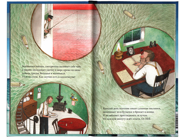 Все эти картинки – словно отражение переживаний самого маячника, его тоски по любимой, которая далеко, его радости от встречи с ней, его счастья. Так неожиданно в чтении нашего семилетки возникли очень серьезные, совсем взрослые темы, которые срочно потребовалось обсудить. В неспешном разглядывании с комментариями у нас рождалась собственная история, которую было интересно сравнить с той, что придумала автор.